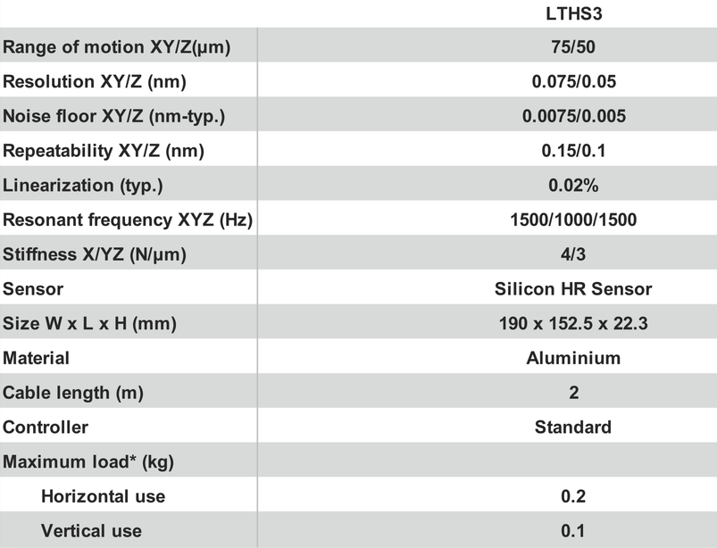 LTHS3 是一个三轴台(X,Y,Z),其运动范围在X和Y轴上可达75µm,在Z轴上可达50µm。由于其非常低的外形(22.3mm),这个纳米定位器很容易集成到倒置显微镜中,大多数情况下会与粗定位显微镜台一起使用(见我们的 混合系统)。
