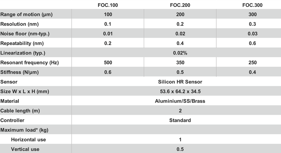 FOC 是一个专门用于显微镜物镜精确定位的纳米位移台。行程可选100、200、300或500微米。FOC 广泛应用于多种场景:Z轴堆栈、3D成像、自动对焦或与自动焦点稳定装置结合使用,后者我们也可提供。该装置由铝、钢和黄铜制成,并配备传感器,提供皮米级别的稳定性。